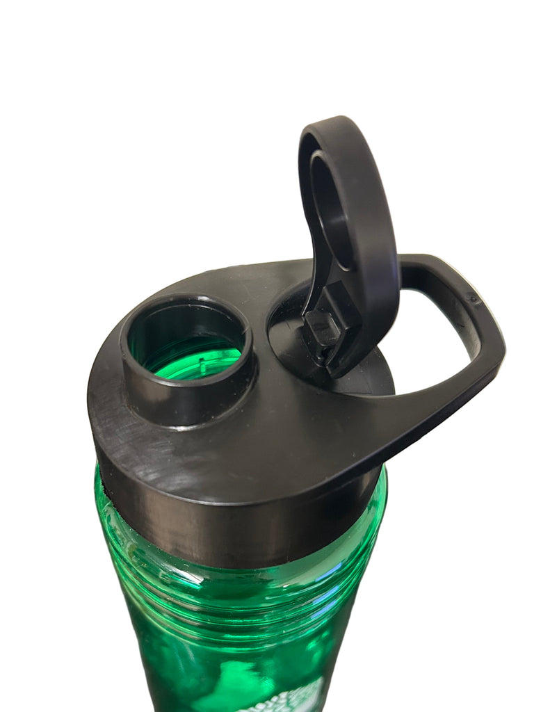 Green plastic bottle with white logo and George School on the front. BPA Free and Dishwasher Safe.